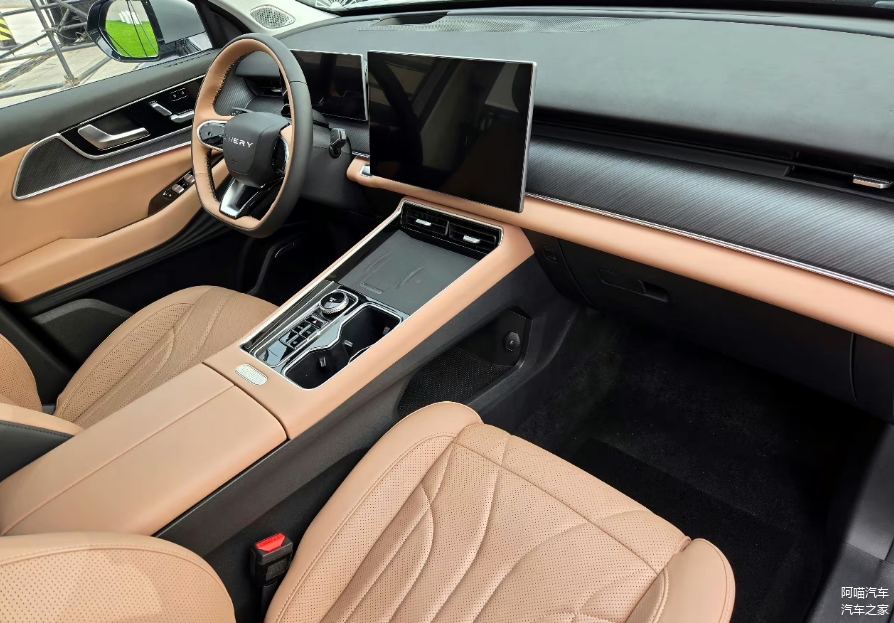 走进车内,瑞虎8L的车厢设计就是自主车型的常规操作了,用料多,配置也丰富。具体来看,这款车采用了环抱式中控台,并且中控台位置带有纹理的饰板,以及皮质材料包裹。而贯穿式空调出风口和中控大屏,在自主车型中很常见了。