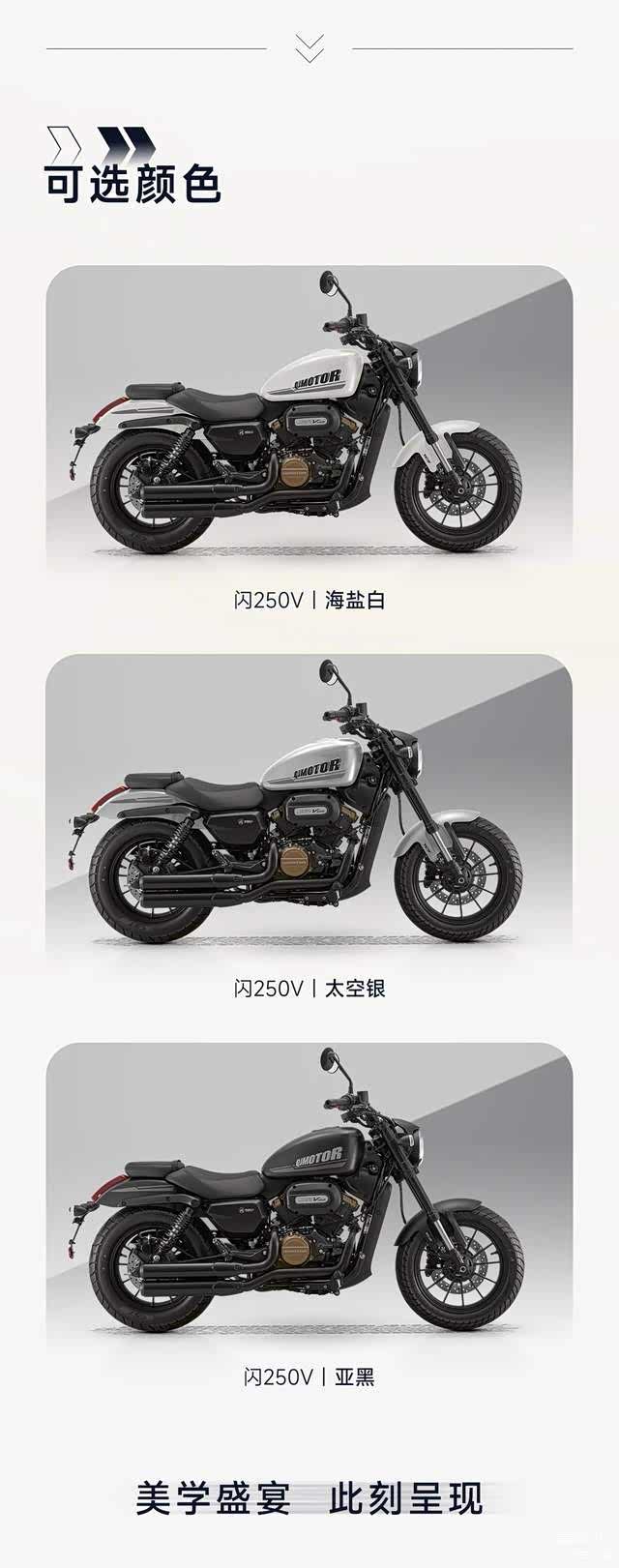新款闪250V外观设计与现款车型相比,经过了多处细节的优化。整车质感与闪300更为相似,复古巡航气质更为明显。其中, V型双缸引擎,使整车造型更显饱满,同时排气系统也伴随发动机结构的变化,换装为了双排双出尾排,视觉上提升了整车的复古韵味。细节方面,采用了全新的侧置空滤器,镂空设计很有机械质感。此外,同步推出了海盐白、太空银、哑光黑3种不同风格的涂装配色,满足了骑手个性化方面的需要。