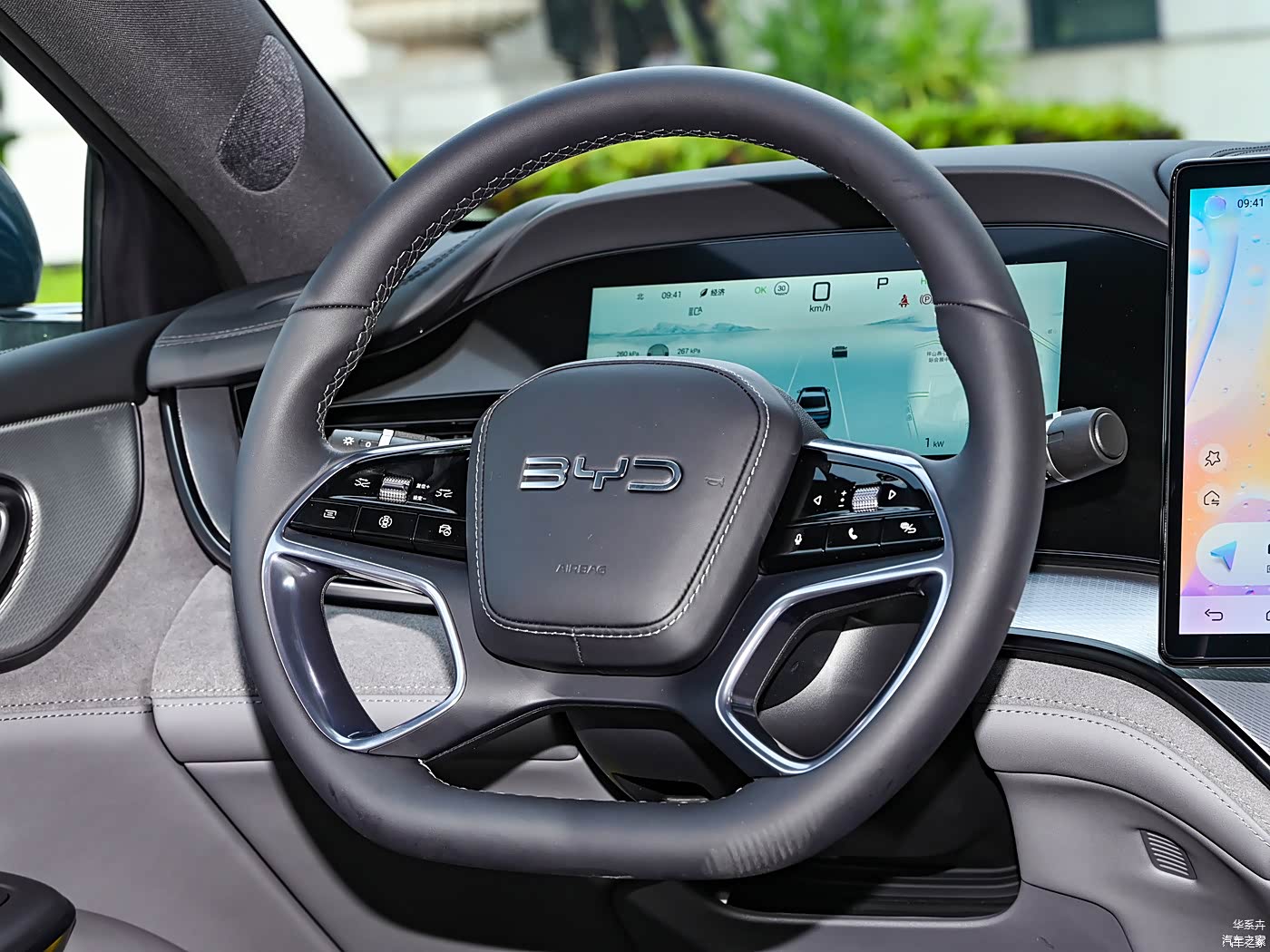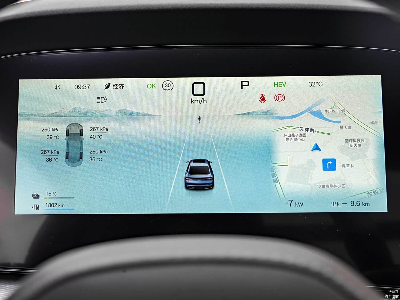 海豹07 DM-i仪表盘以数码常见风格为主,缺点就是光线太亮时有些显暗,显示信息比较比较丰富,轮胎信息、行驶信息、挡位、导航信息等都有。
