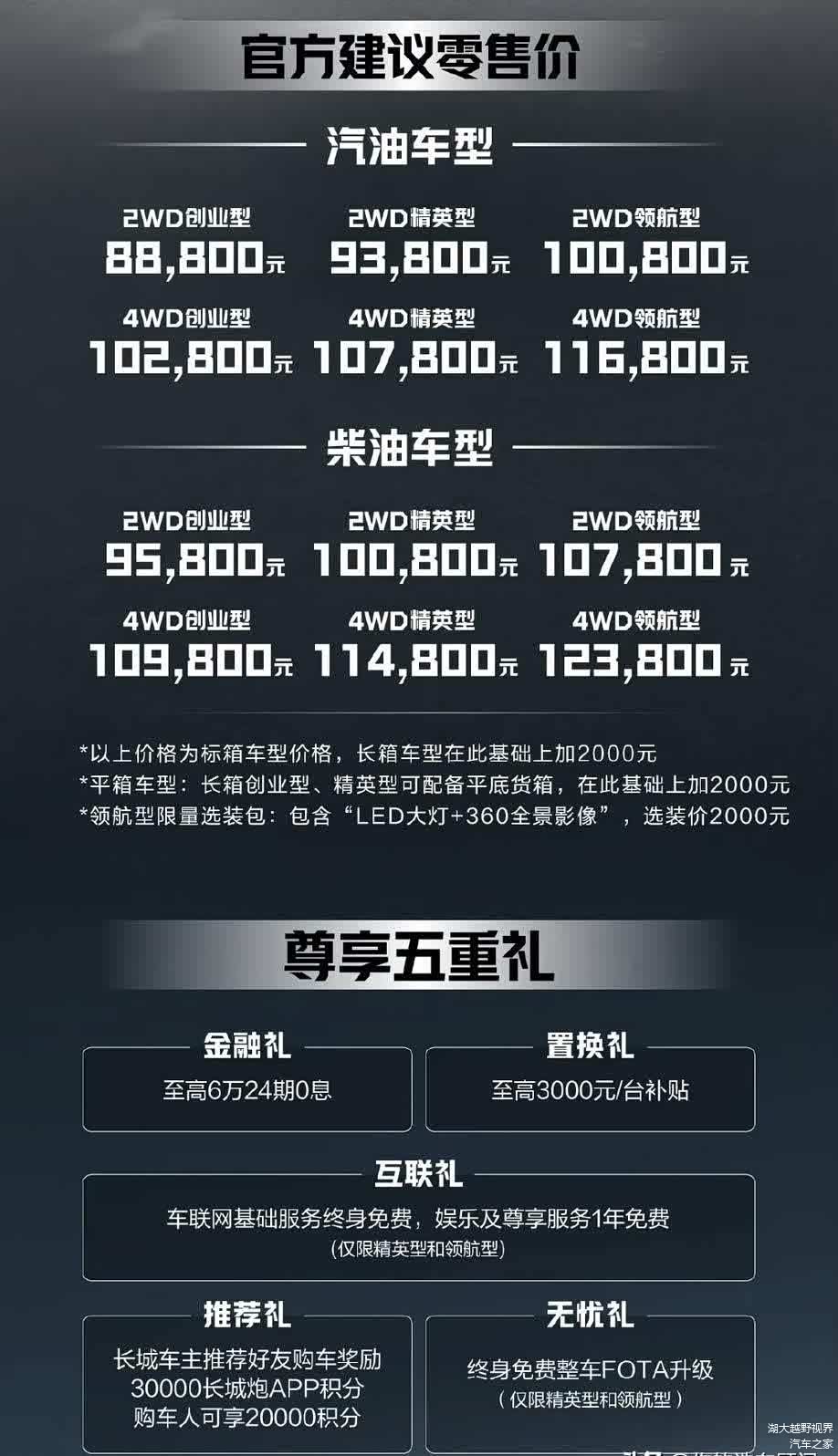其中,汽油车型售8.88-11.68万,柴油车型售9.58-12.38万。所有价格均为标准货箱车型,长货箱和平底货箱需要加钱选装,规则和上市政策如上。