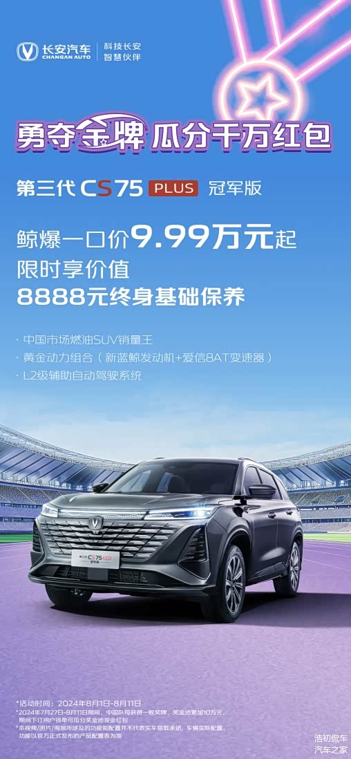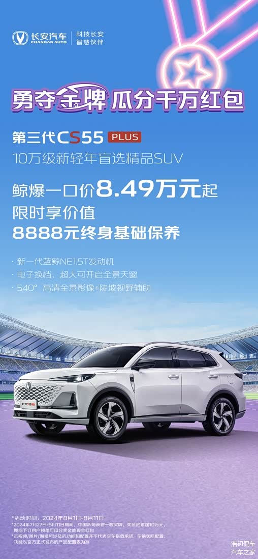 当前,国际赛事激战正酣,中国汽车市场竞争也异常激烈。为庆祝中国体育健儿在赛场上摘金夺银、勇创佳绩,同时给中国消费者带来更多购车福利,长安汽车于8月1日至8月11日期间,特别推出了“勇夺金牌 瓜分千万红包”的宠粉活动,并针对全系多款车型实施了不同程度的夏季促销政策。