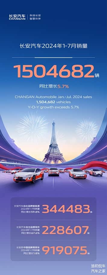 近日,长安汽车正式披露了最新的产销快报,数据显示长安汽车1-7月累计销售达到1504682辆,同比增长5.7%,品牌势能进一步提升。其中,中国品牌乘用车板块1-7月累计销售达到919075辆,同比增长1.8%,旗下UNI系列、逸动系列、CS75系列、CS55系列等爆款车型继续在细分市场保持领先。自主品牌新能源板块1-7月累计销售344483辆,同比增长高达59.8%,强势领跑。