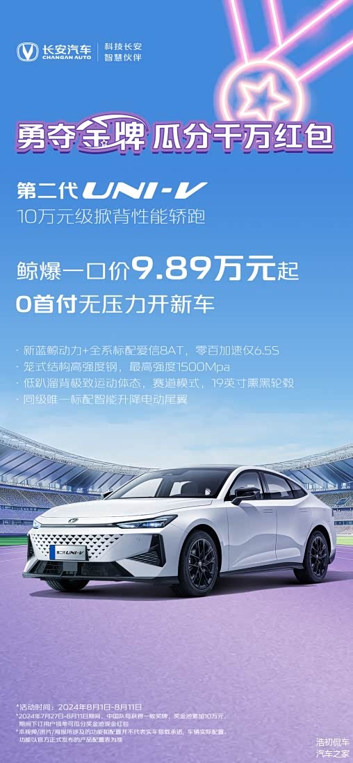 第二代UNI-V作为10万元级的掀背性能轿跑,采用纵横万象致美运动外观设计,全系标配智能电动尾翼、电动掀背门,以及全新升级高品质内饰,完美诠释运动之美。尤其在安全方面,该车还全系标配方舟笼安全车身,拥有70%同级领先的高强钢占比,领先的L2级智能驾驶辅助和智能化交互体验,为轻松、安全的出行更添趣味。现以超低售价9.89万元起售,让消费者无压力开启新车生活。