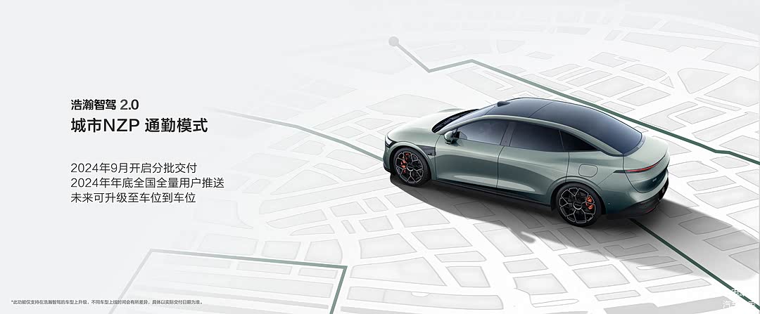 极氪城市NZP功能则为无图(轻图)智驾功能,可不限城市,在全国的主要城市道路上,有导航就可开启领航辅助,该功能将于2024年底开启分批交付;2025年Q1开启D2D门到门能力分批交付。