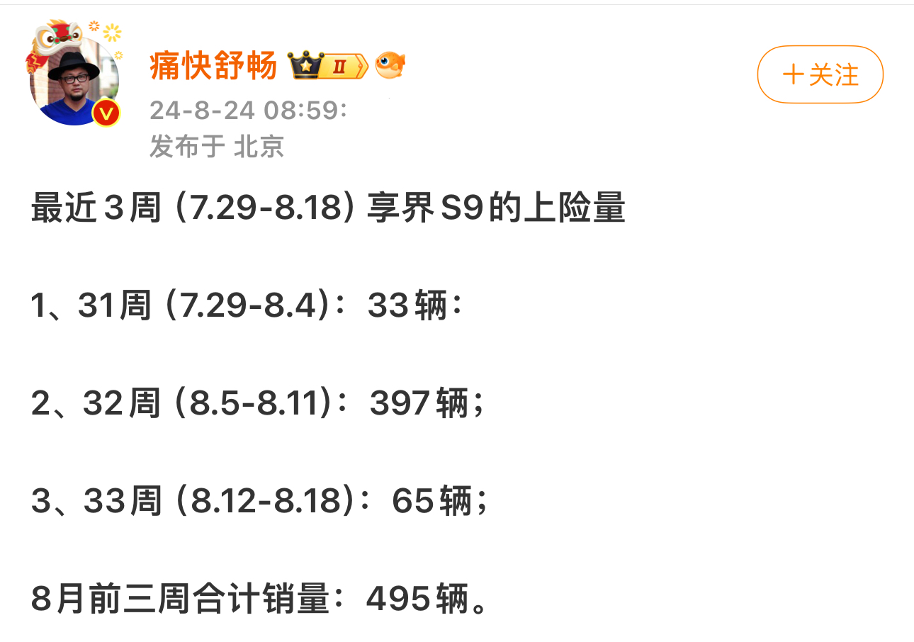 结果事实证明,高端纯电在中国市场就是不好卖,享界S9想要复刻问界M9的荣光,除非尽早把增程版本上线。近日,又一渠道大V发布了享界S9八月前三周上险量,数据分别为33辆、397辆和65辆,合计总数是495辆。