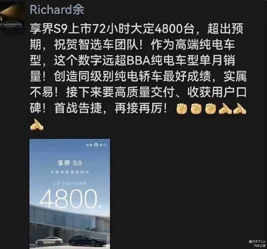 享界S9上市24小时,大定订单破2500辆;上市72小时,大定破4800辆,余承东亲自发文表示祝贺,称赞其销量已经超过了奔驰、宝马、奥迪纯电车型的单月销量,远超团队预期。就30万~40万纯电来说,这个大定数据已经相当耀眼,只不过前期口无遮拦的部分车评人,把这台车架的太高,有的说它能月销破2万,也有人说它的月销超5万都是没有问题的。