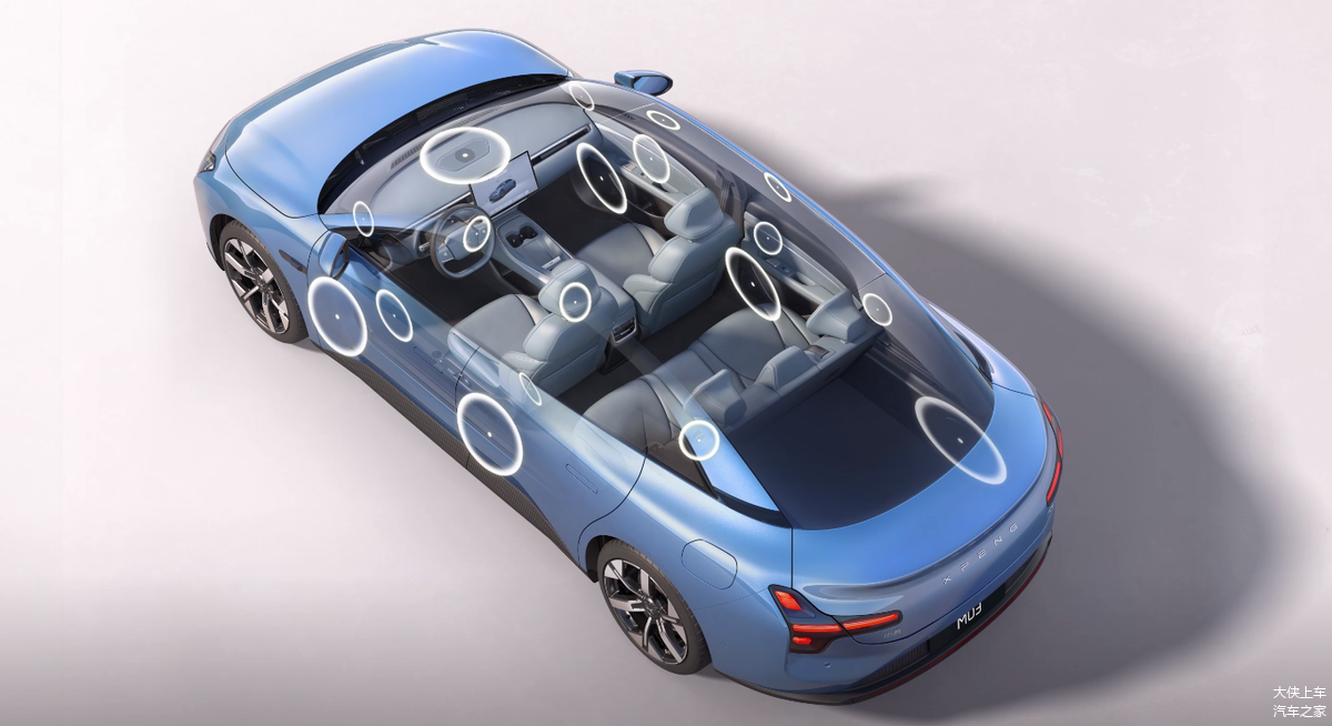小鹏的团队认为车载音响很重要,在M03身上,18个扬声器组成7.1.4声道立体环绕声,还有840W最大功率。除了常规位置外,还在车顶配备了4个吸顶扬声器,打造出天空声道,且可以自适应调节音效参数,呈现出最佳播放效果。这在10万级别的A级车中是相当少见的,毕竟大多数音响也就是“听个响”。