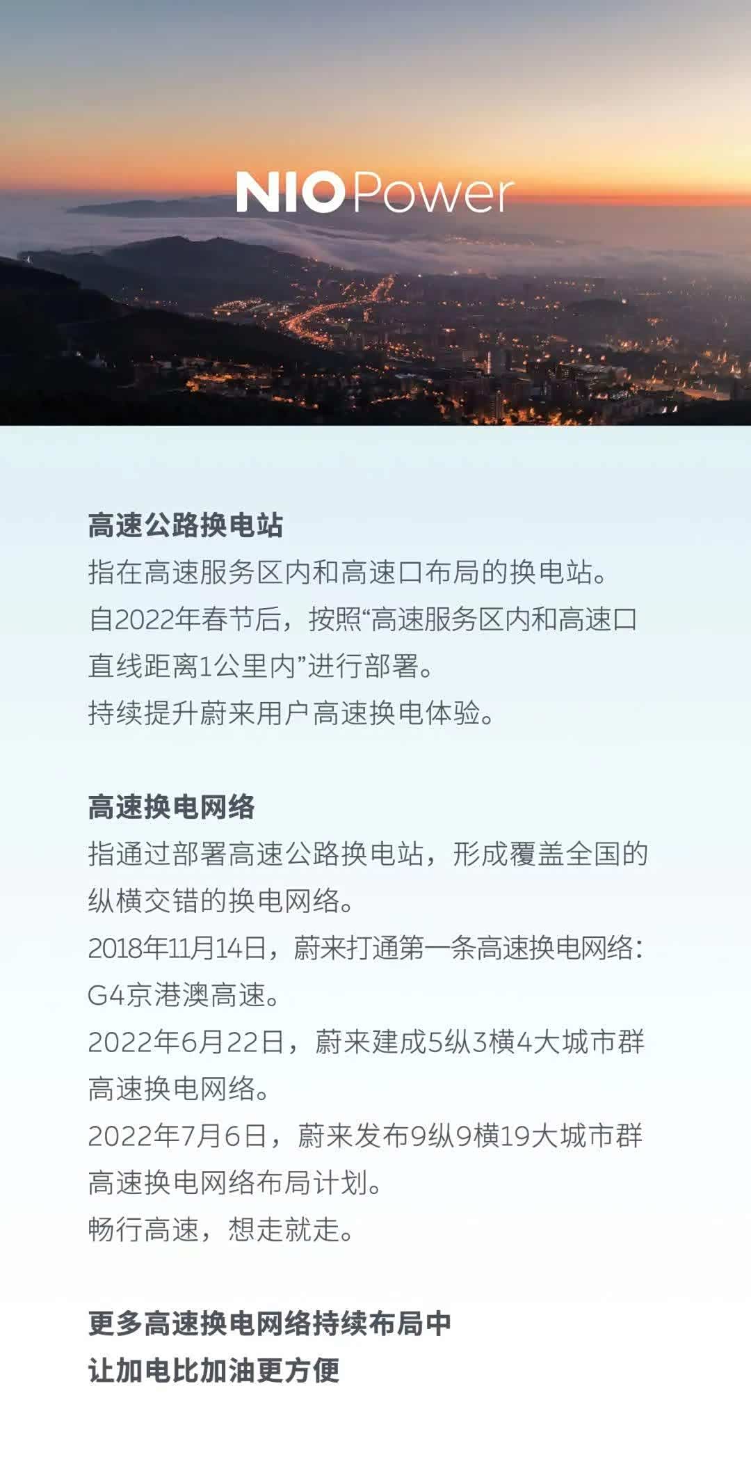 此外,蔚来还发布了NIO Power高速换电网络建设新计划:蔚来将在2025年建成全面覆盖九纵九横十九大城市群的高速换电网络,为用户带来更便利的城际出行加电体验。