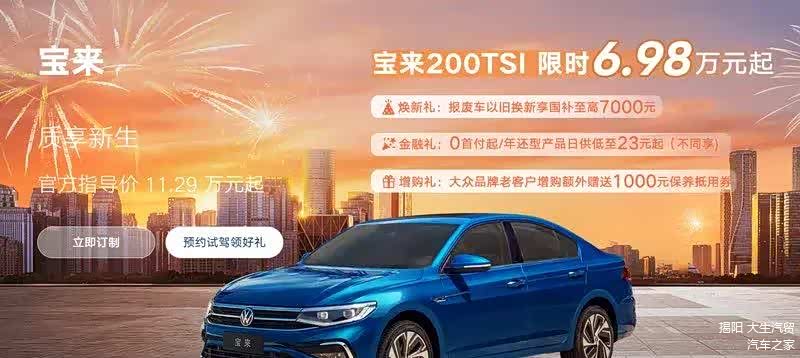 一汽-大众官网显示,自7月13日起至7月28日,一汽-大众推出限时购车政策,宝来低至6.98万元起、速腾低至8.98万元起。