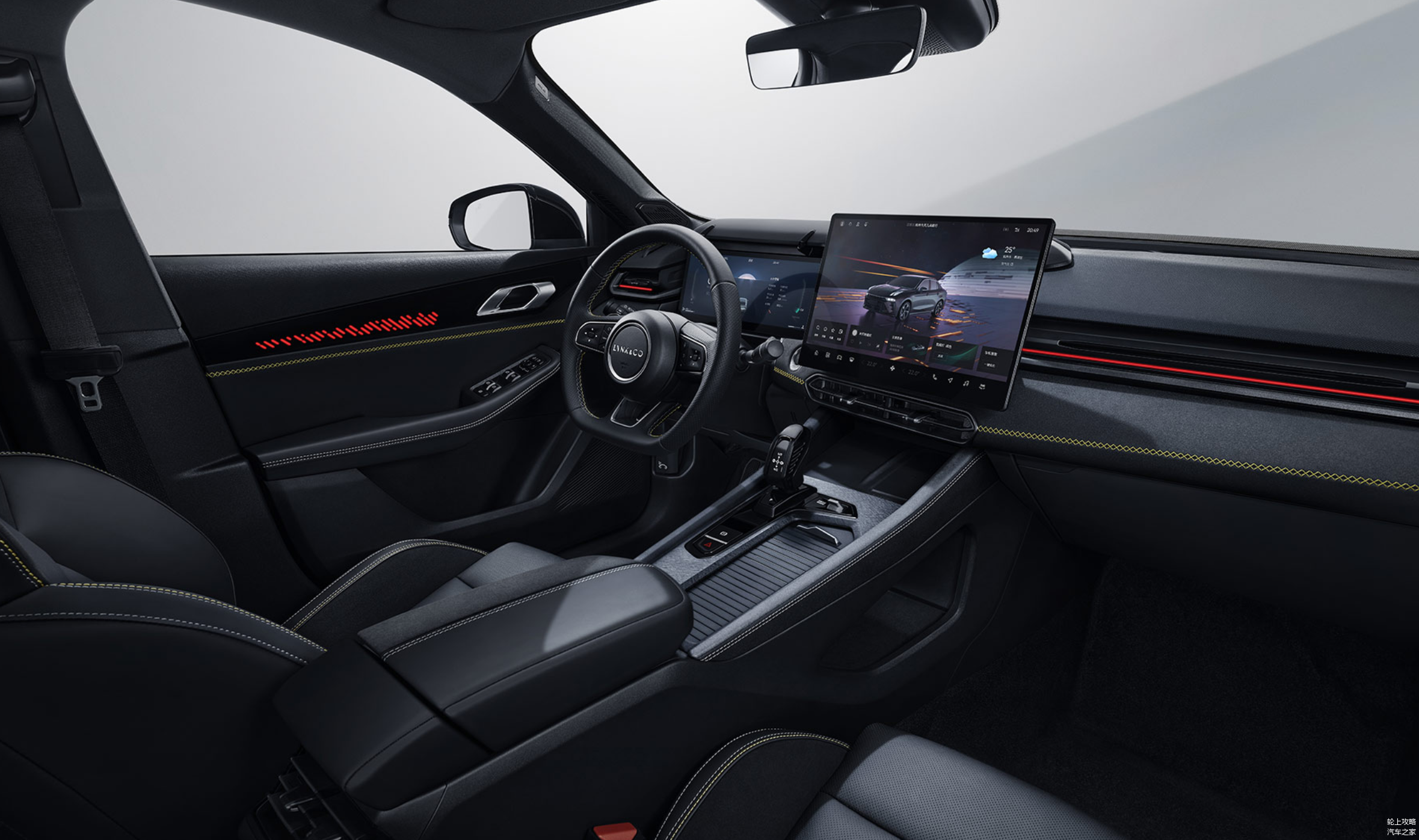 配置方面,标配 6 安全气囊、 360全景影像,后泊车雷达,LED 自动头灯,全景可开启的电动天窗,外后视镜折叠/加热,运动尾翼,皮质多功能方向盘,一体式仿皮运动座椅,支持前排电调;双驱自动恒温空调,有后排空调出风口和主动座舱清洁,以及 CN95 活性炭空调滤芯;自动雨刷,无钥匙进入和启动, 12.3 英寸全液晶仪表, 15.4 英寸中控大屏。车机使用 8155 芯片,内存16G + 128G;8 扬声器。