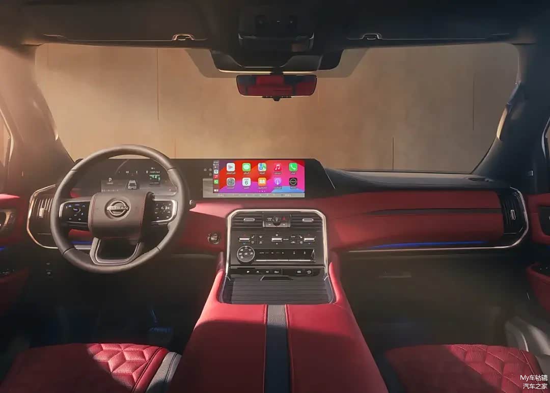 全新一代途乐的颜值水平有目共睹,霸气且充满时尚感,同时内饰氛围也比较豪华和充满科技感,黑红颜色的用料搭配也营造了一些运动气息。新车将会标配双12.3英寸联屏设计,内置NissanConnect 2.0智能座舱系统,而中高配车型则会升级为双14.3英寸联屏以及HUD抬头显示的组合。