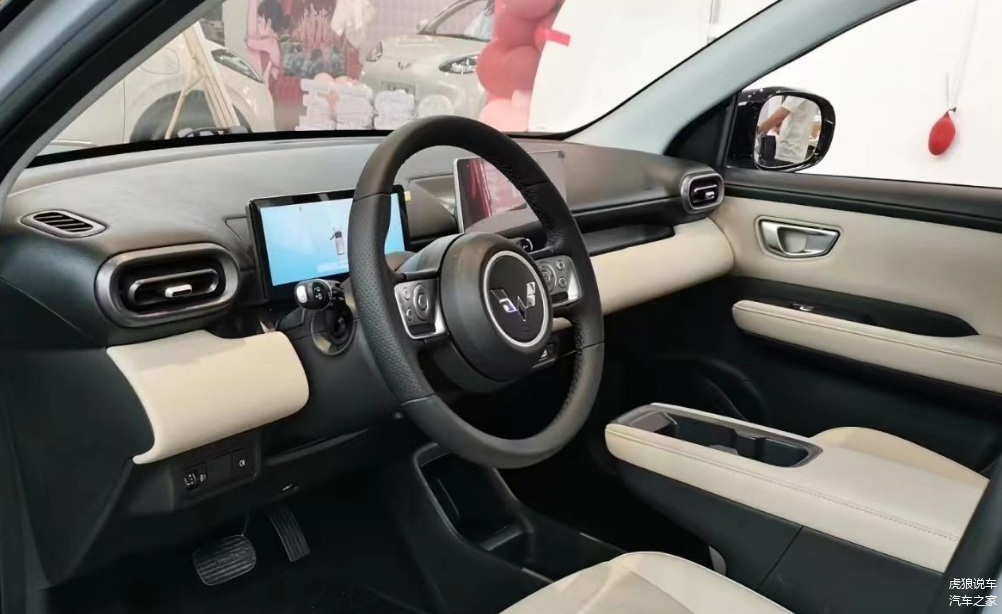 内饰方面,五菱缤果SUV五座版依旧延续了缤果PLUS的设计风格,搭载悬浮式仪表和中控搭配,中控台上有一个贯穿式的储物槽,提升了车内层次感,并且提高的空间储物能力。细节方面,缤果SUV五座版提供空境绿、暖沙白两款内饰色,能够看到车内用上了大量软质包裹,并保留了不少实体按键。