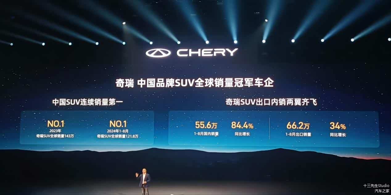奇瑞-中国品牌SUV全球销量冠军车企;在2023年,奇瑞SUV全球销量143万辆,位列全球第一;2024年1-8月,奇瑞SUV全球销量便达到了121.8万辆,位列世界第一,这个数字仍在增长中;
