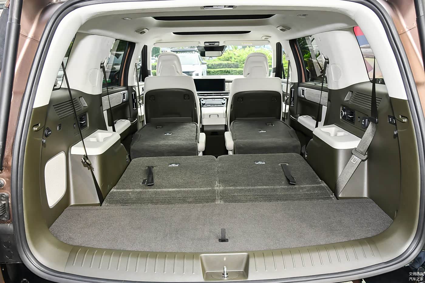 空间方面,以家的设计理念打造空间,最大装载容量达到同级最优的2,046升,二三排放平后进深2.05米,二排座椅搭载一键电动调节,角度可向前调节至完全放倒(后备箱侧饰板处也设置有二排放倒按键); 三排座椅可向前完全隐藏放倒,让车“秒变”超级大露台。
