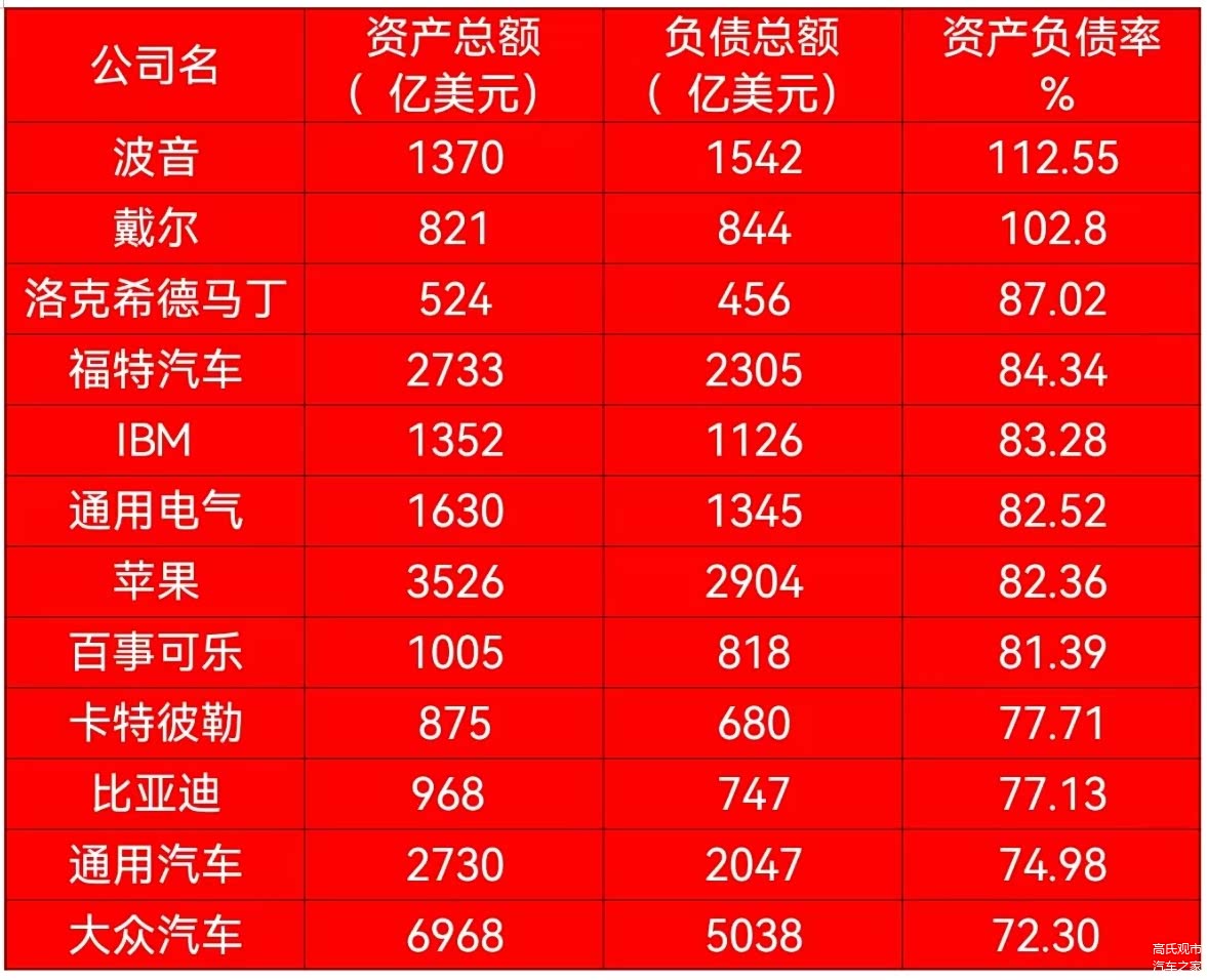 负债最多的是波音、戴尔,这两家的负债率都超过100%。然后是洛克希德马丁,苹果、百事可乐这些经典IP也上榜了。当然车企也不少,包括美系的通用、福特,以及世界第二车企大众。如果要硬凑一下,卡特彼勒应该也能算车企,只是主要做高端重卡。