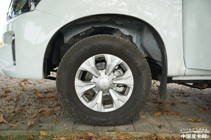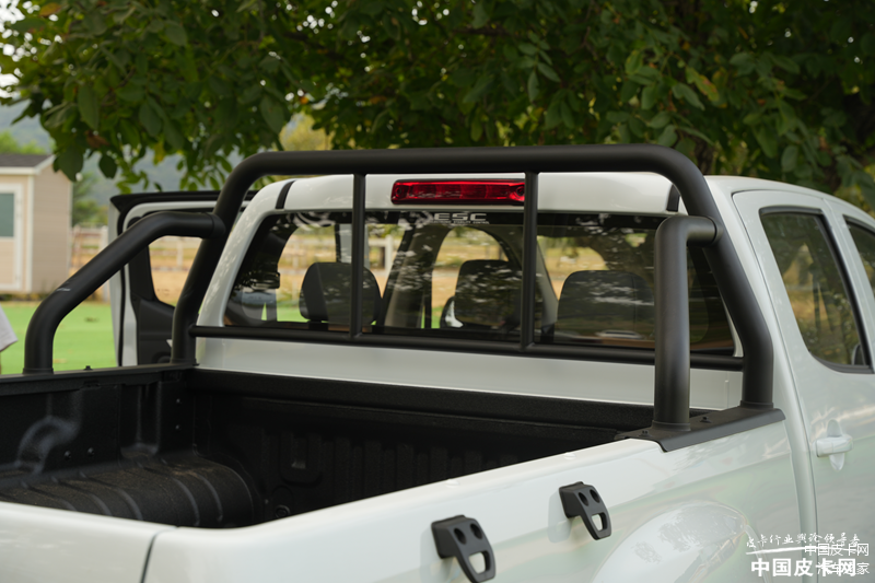 除此以外,车身外部还配备高位刹车灯、后部倒车雷达、货箱防滚架等等,轮胎尺寸为235/70R16,并且配备四轮碟刹。