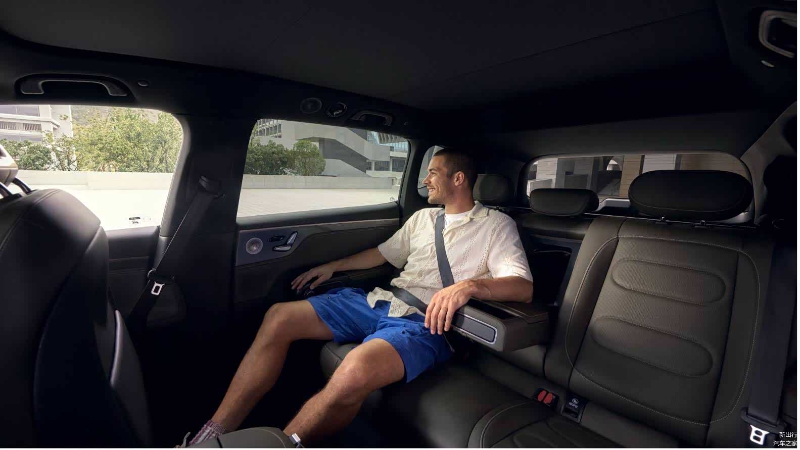 去到后排, smart 精灵 #5 设计了一键头等舱模式,一键即可将副驾驶调至最前且靠背翻折,坐在后排的乘客也能够有犹如置身真正头等舱的临场感。细节优化上,后排乘客可以获得 480mm 的膝部空间,身高 180cm 的体验者将二排座椅靠背调节到最后,这时的头部空间剩余一拳三指,靠背调节到最前头部空间则剩余一拳三指。后排靠背还支持 10 ° 电动可调,还配备了专属的航空灯,即使阅读或办公也显得从容许多,这些配置放在同级车中属于越级的配置。