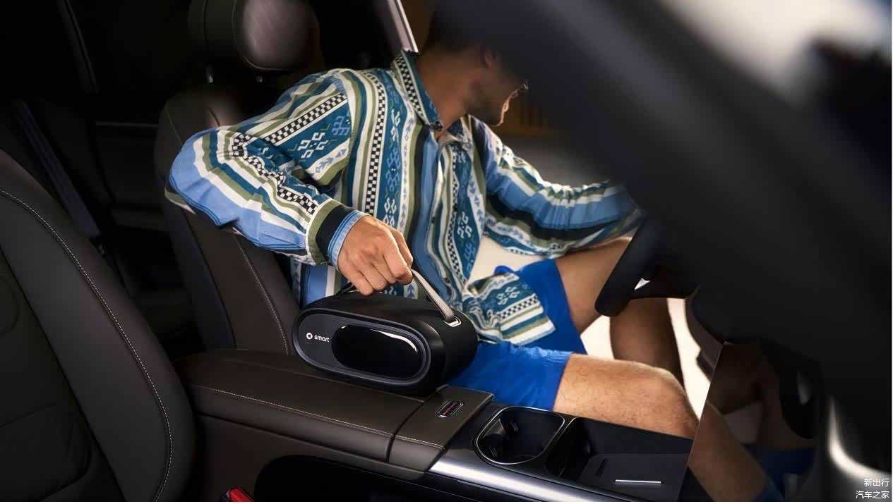 分享两个我觉得最有实用且有趣的配置——车载便携 HIFI 音箱,它通过了 Hi-Res 认证,并且拥有 42Wh 的大电池,可以连续工作 8 小时。同时音响自带 4 个麦克风,可在户外远程实现车内的所有语音操控,比如切歌、换一部电影投屏等,即使在车外也能和车内的智能座舱随时互动,科技感满满。开着 smart 精灵 #5 在户外撒野时,便携 HIFI 音箱就是随时能够为用户提供氛围感和律动的随心伙伴。因此,它可以是一个随身携带的便捷式移动音响,也可以作为户外探索时的移动充电宝,亦或是一台随时交流的智能人工助手。
