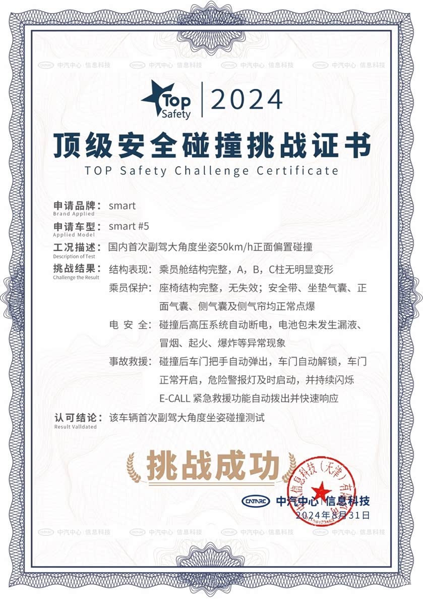 经过包括50公里正面偏置碰撞,行业内号称魔鬼碰撞的25%重合度小偏置碰撞等在内的130多项碰撞与安全的测试,全新smart精灵#5的整车稳定性卓越,符合全球测试标准,各种环境下都展现出优秀的安全性能。