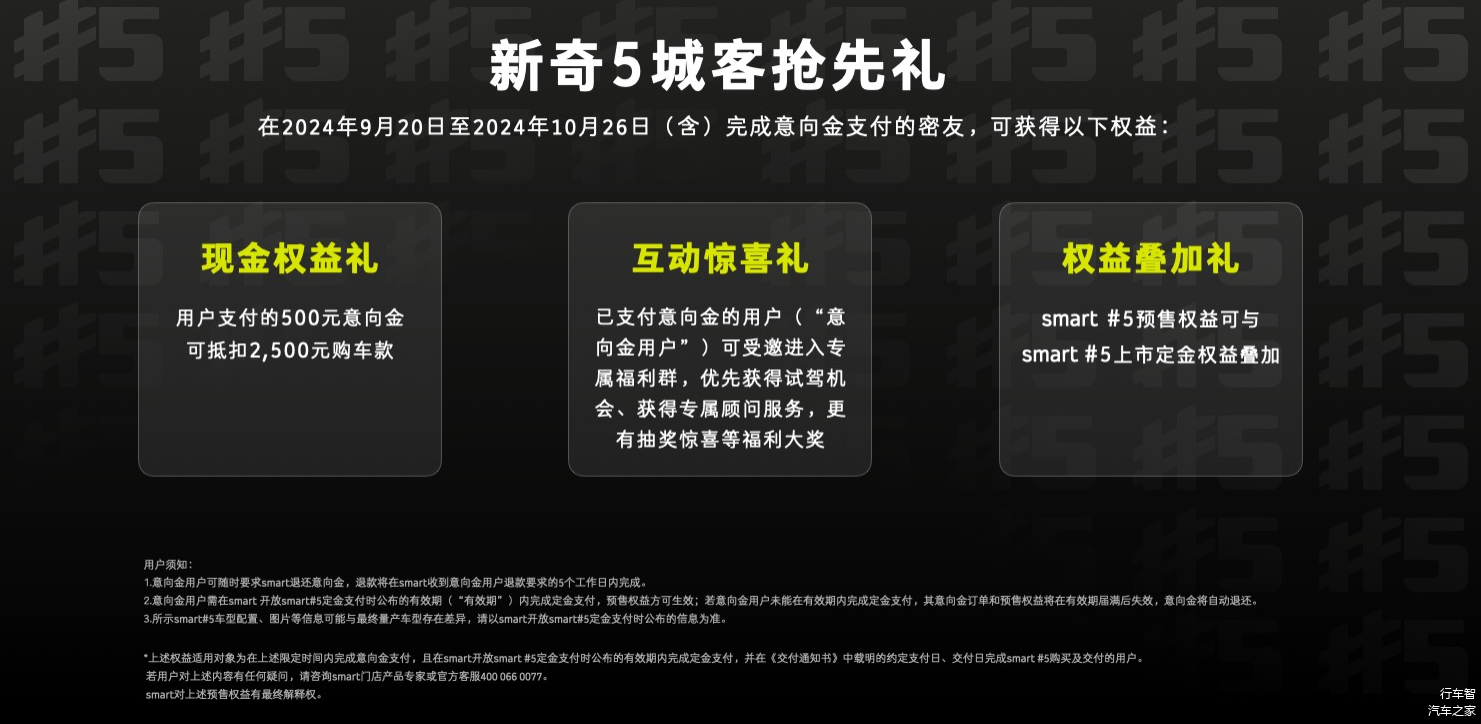 同时,全新smart精灵#5还为“新奇5乘客”准备了三大预售权益。10月26日(含)前完成意向金支付的密友,可享“现金权益礼”——用户支付的500元意向金,可抵2500元现金购车款;“互动惊喜礼”——已支付意向金的用户进入专属福利群,可优先获得试驾机会、专属顾问服务,更有抽奖惊喜等福利大奖;“权益叠加礼”则支持预售权益与上市定金权益叠加,豪华奇旅大五座SUV触手可及。