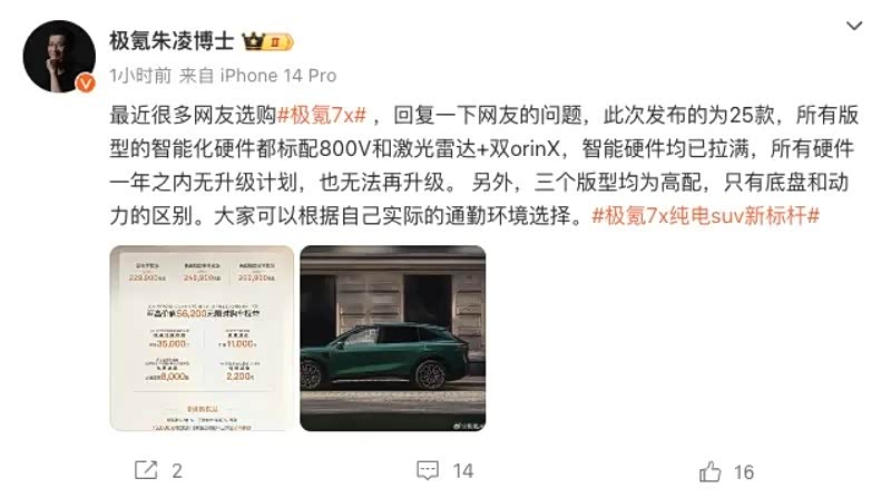 9 月 24 日,极氪智能科技副总裁朱凌在微博上透露了极氪 7X 的重要信息。这款于 9 月 20 日正式上市并同期开启全国交付的新车,展现出了强大的实力和魅力。极氪 7X 2025 款在智能化硬件方面可谓诚意满满,标配 800V 和激光雷达+双 OrinX,智能硬件全部拉满,且一年内无升级计划。三个版型均为高配,仅在底盘和动力上有所区别,让消费者可以根据自己的实际通勤环境进行选择。
