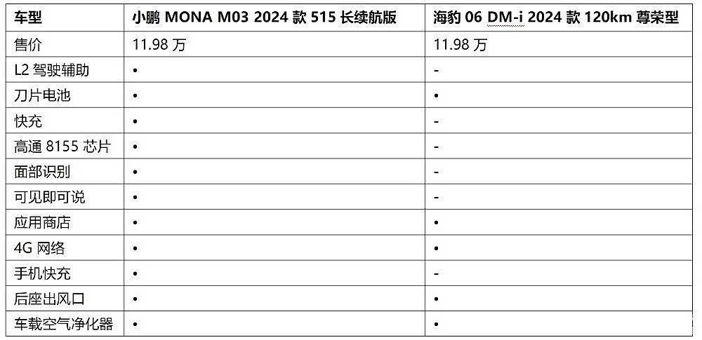 以轿车市场为例, 小鹏MONA M03(图片 | 参数 | 询价) 2024款515长续航版售价为11.98万元,海豹06 DM-i 2024款120km尊荣型售价为11.98万元,两款车均定位于家用轿车市场,价格完全一致,都属于普通消费者能承受的范围,那么哪一款车更值得入手呢?
