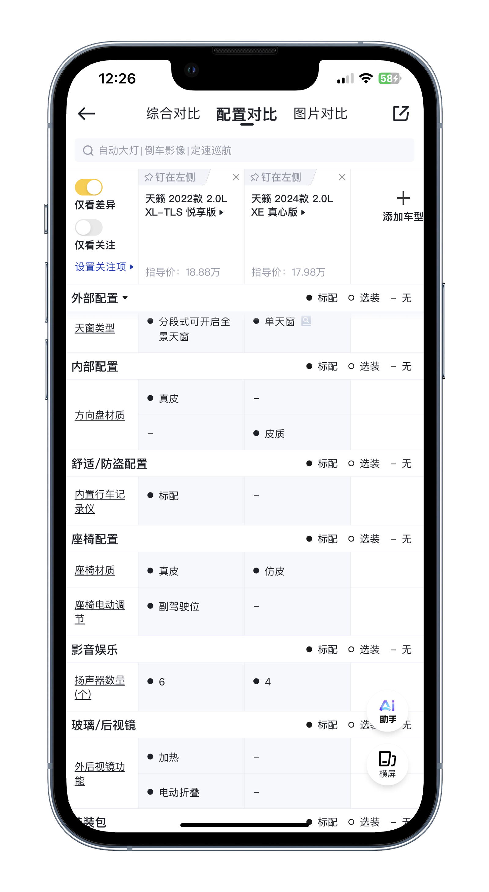 不过拉开配置表一对比,你就会发现这个“真心版”相对之前的悦享版,配置上阉割了不少。首先全车的真皮材质几乎都换成了仿皮材质,像是方向盘、座椅,都给减配了。另外分段式全景天窗给阉割成了小天窗,副驾座椅的四项电动调节给改成了手动调节,扬声器的数量也从6个缩水到了4个,还给减配了内置行车记录仪、外后视镜电动加热和折叠功能,你把这些功能配置 折算一下的话,差不多也就是这3000块钱的差价吧。