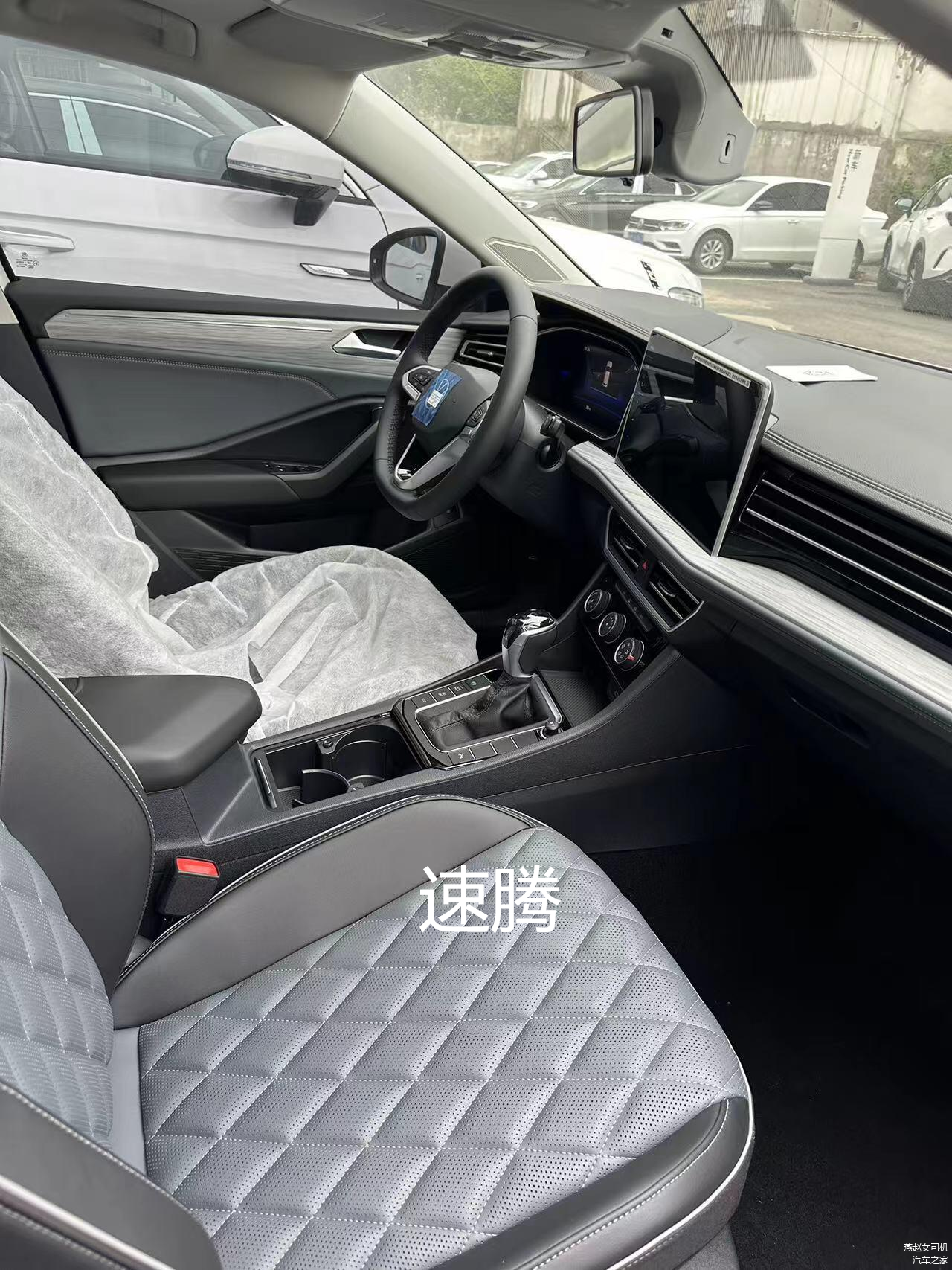内饰图虽然模糊,但还是可以看出同样延续了速腾的设计风格。双色环抱式座舱内配备悬浮式中控大屏、全液晶仪表盘、贯穿式空调出风口以及三幅式多功能方向盘等。但由于是路试车,预计量产车型还会有所调整。同时还可以看到,捷达VA7将配备电动单天窗,并提供无天窗版本。