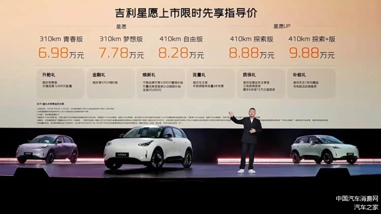 [新车上市]10月9日晚,吉利全新车型—— 星愿(图片 | 参数 | 询价)正式上市,新车定位小型纯电车,搭载了FlymeAuto智能座舱。此次上市,新车共推出5款车型,限时6.98万-9.88万。另外,购车用户还能享受官方提供的六重好礼,详细内容请见下文: