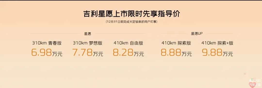6.98万起步,给零跑T03、哪吒早期车型,比亚迪海豚,长城欧拉,甚至包括刚上市交付的小鹏MONA M03都会带来一定的价格压力。虽然小鹏MONA M03和吉利星愿定位不同,价格区间也不同,但这两款车都有智驾功能,都是年轻群体消费,都是年轻人的第一辆车,吉利星愿甚至群体会更年轻。