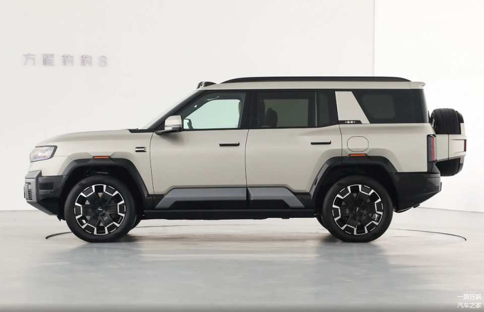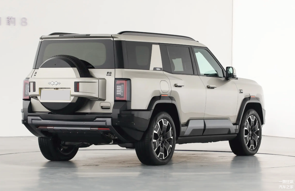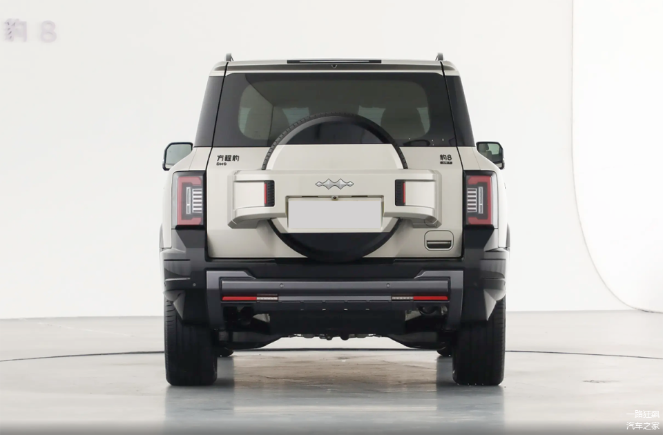 整个侧面表现并不陌生,完全可以看做是豹5的衍生版!标志性的方盒子设计,也算是目前的主流。侧面上,新车并没有采用传统的腰线,但在前后的轮眉处做了隆起,一方面保证了新车的完整性,另一方面也带来了力量感!而顶部依旧是悬浮式的风格,乍一看,这款方程豹豹8更有些路虎卫士的既视感。尾部上,新车标配有外挂式的备胎,其中两侧还做了加强处理,先不说它的功能性如何,单就外观已经足以吊打对手。而两侧则是堆立的C字形尾灯,另外宽体车身在尾部得以完全展现,后包围与车头正好形成呼应。