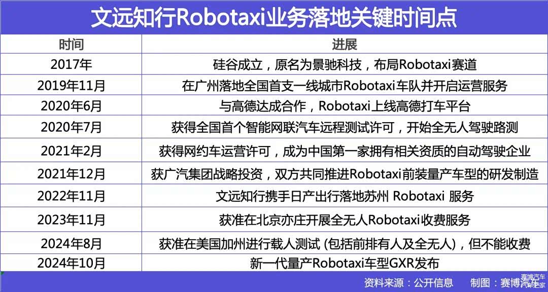 2019年,文远知行与广州白云出租汽车集团合资成立文远粤行,并于同年11月在广州黄埔区推出全国首个全对外开放的Robotaxi运营服务;2020年6月,文远知行Robotaxi又上线高德打车平台。