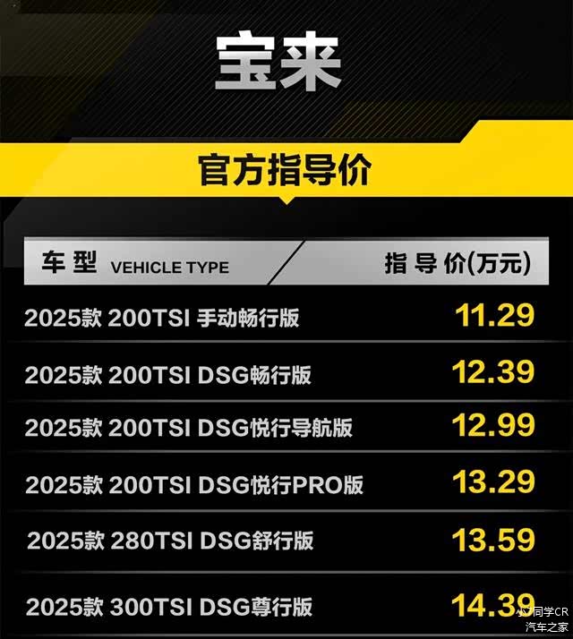 2025款大众宝来提供6款配置车型,分别为:200TSI 手动畅行版、200TSI DSG畅行版、200TSI DSG悦行导航版、200TSI DSG悦行PRO版、280TSI DSG舒行版、300TSI DSG尊行版,售价11.29-14.39万元。