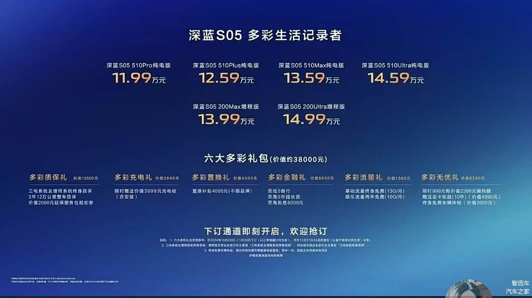 最后我们来聊一下深蓝S05的一些购车福利,比如它提供了3年或12万公里整车质保以及三电系统和增程系统终身质保、价值3999元的充电桩(含安装)、价值4000元的不限品牌置换补贴等福利,再结合11.99万~14.99万元的售价,确实很有吸引力。