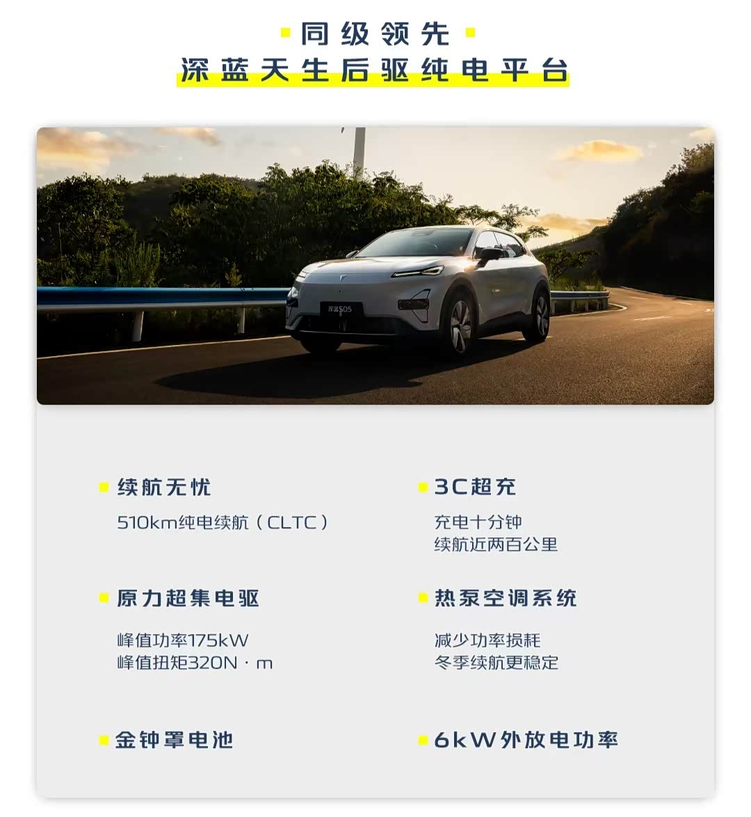 不出意外的话,深蓝S05应该会成为12万~15万区间的爆款车型。因为从新能源SUV的角度来看,它既有纯电、也有增程,而且还有大空间和后驱加持,产品力没有短板。另外,深蓝S05还有4K云台相机、华为技术赋能的百万像素智趣光影大灯、行泊一体智能驾驶辅助系统、智慧情感座舱,这些都是年轻人喜欢的产品卖点。现在唯一需要担心的,可能就是深蓝S05的交付速度了,你们认为呢?