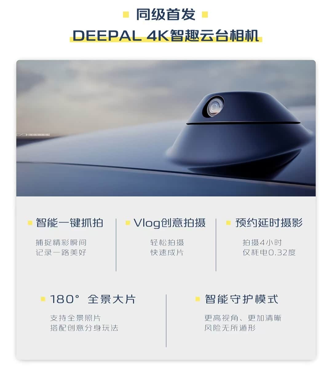 此外,深蓝S05还有个很好玩的功能,那就是DEEPAL 4K智趣云台相机,同价位很少见。另外,除了最入门的纯电Pro版之外,其他版本都可以选装这个4K智趣云台相机,选装价格仅需3999元,还是挺便宜的。