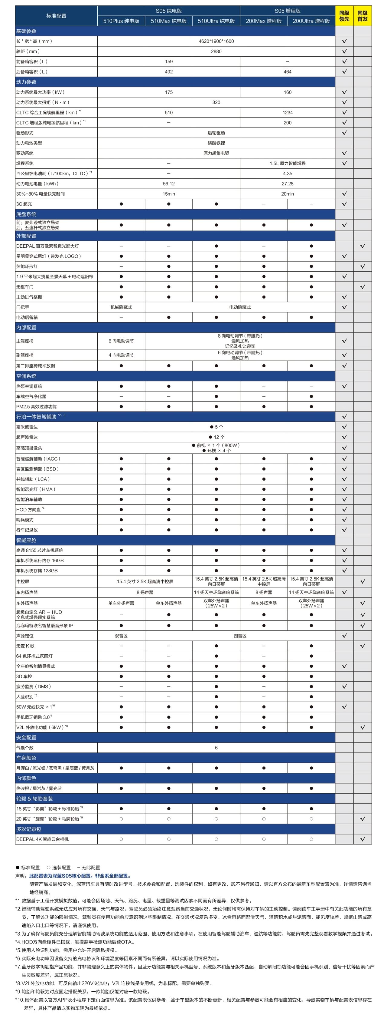 接着我们来看一下配置选择,由于目前510Pro纯电版还不能在线上下订,所以暂时不讨论这款车型。其他5款配置中,我个人觉得510Plus纯电版的配置就已经很够用了,像是1.9平米全景天幕、行泊一体智能驾驶辅助系统、50W手机无线充电、15.4英寸2.5K中控屏、高通8155芯片都有,价格却只要12.59万元。