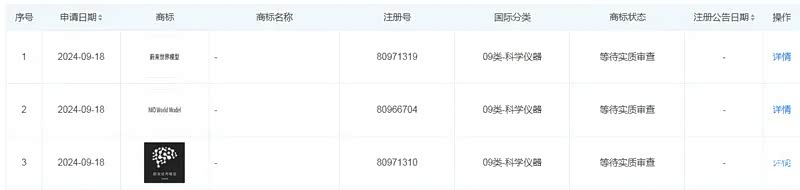 日前,天眼查知识产权信息显示,蔚来汽车科技(安徽)有限公司申请注册3枚“蔚来世界模型”“NIO World Model”文字及图形商标,国际分类为科学仪器,当前商标状态均为等待实质审查。