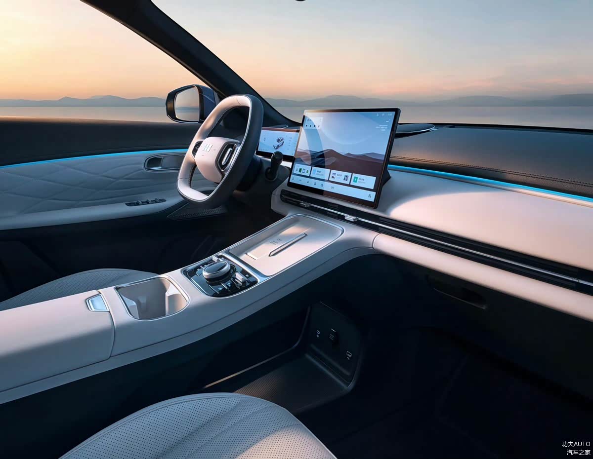 来到车内,银河星舰7沿用了吉利银河家族的简约设计,不过中控大屏幕和车内氛围灯还是营造出了不错的质感。此外,50W无线快充、怀挡设计和Flyme Auto车机系统也均为标配。