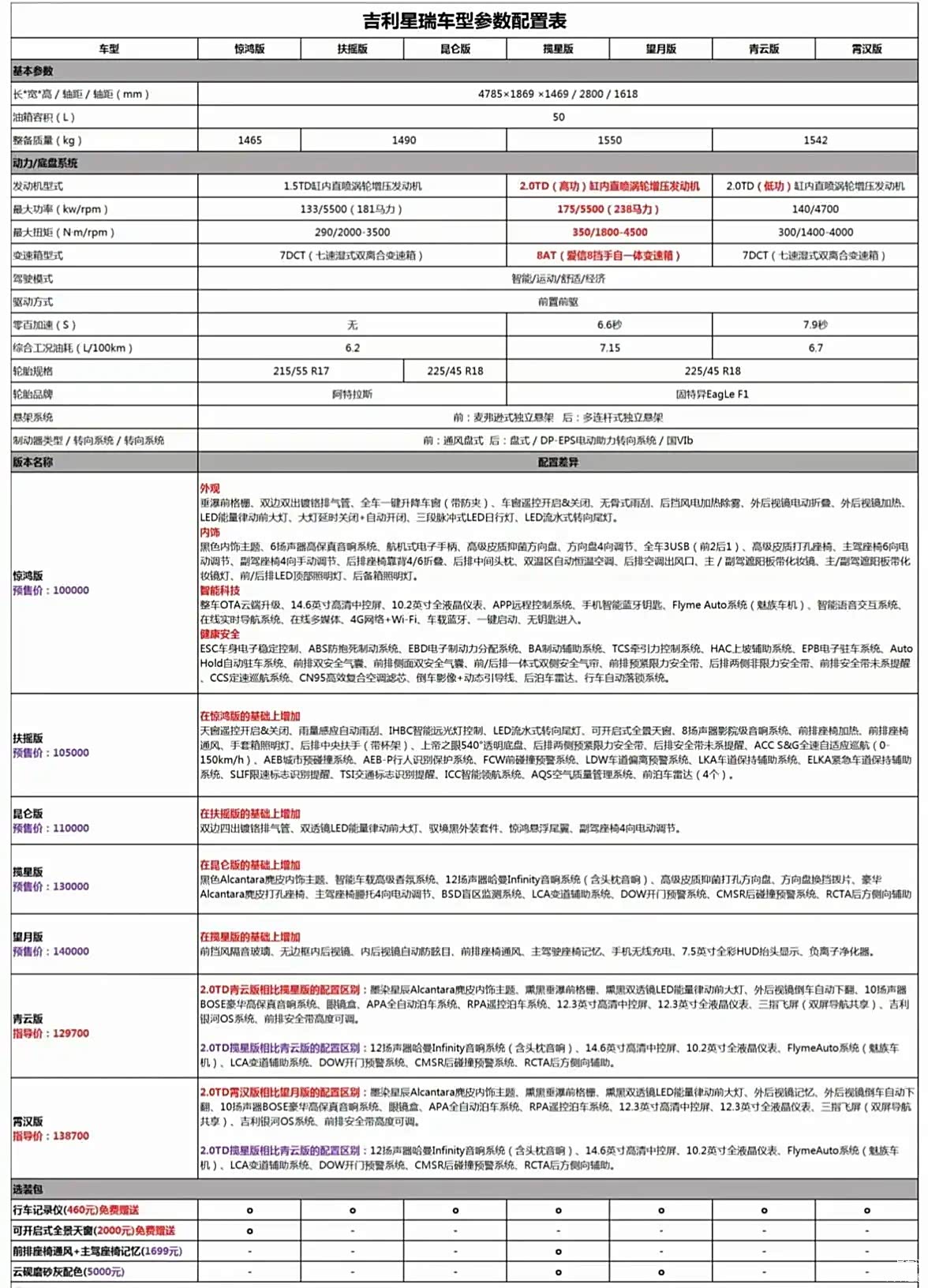 在动力性能方面,惊鸿版、扶摇版和昆仑版都选用了具有1.5T功率的发动机,这台发动机的峰值输出功率高达133kW(181马力),并且配有7速的湿式双离合变速箱作为动力设备;揽星车型以及望月车型将搭载最大功率为2.0T的高性能发动机,其预计的峰值功率将达到175kW,折合为238马力,并将搭配爱信8AT的速变盒;青云版和霄汉版都配有2.0T的低功率发动机,这些发动机的最大功率可以达到140kW(或者190马力),并与7速的湿式双离合器变速器完美搭配。无可争议,有关新型汽车的具体数据还需要由官方进行更加详细的公开和披露。那么,您对25款星瑞东方曜车型的定价有什么见解或者推荐呢?(预计资金范围是9.97万至14.57万元)请在评论区给出您的观点。