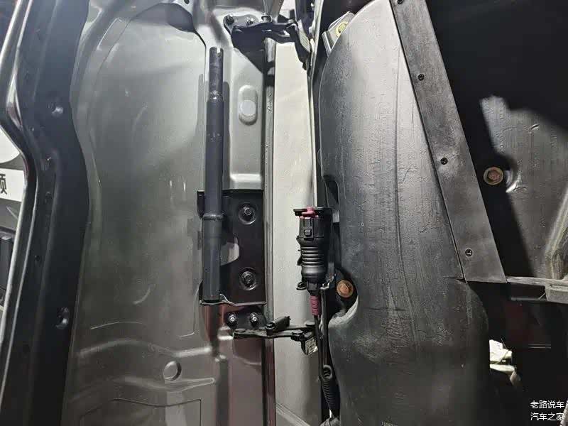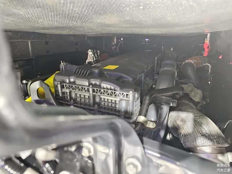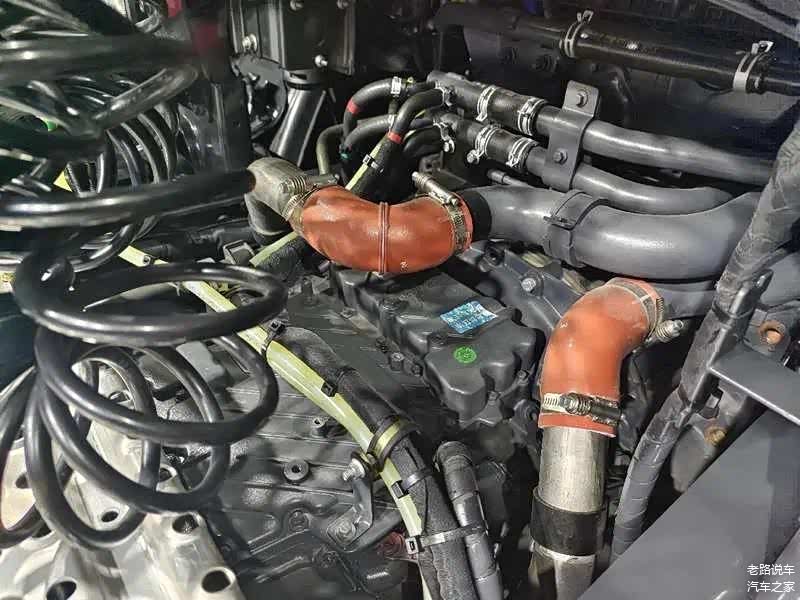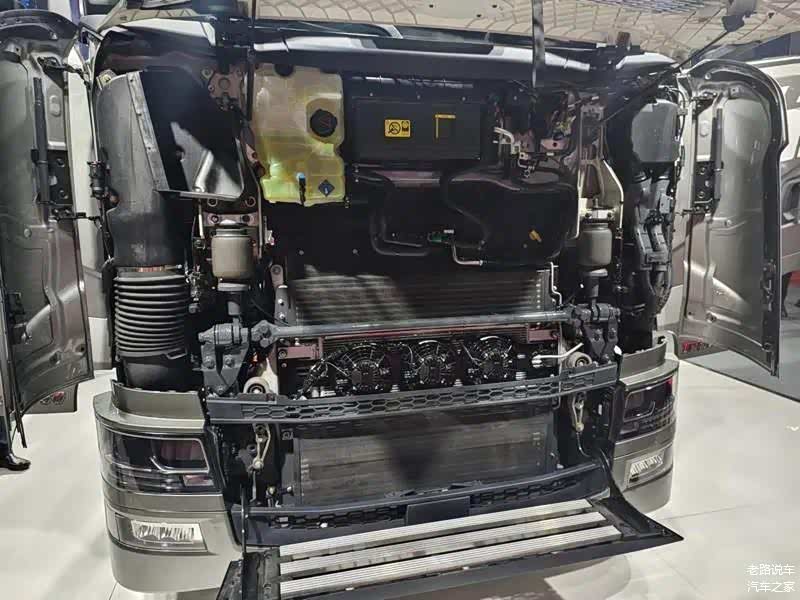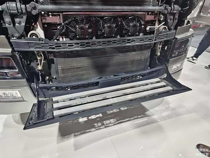 打开前面罩,左右两侧导流板也可以展开,可以看到左侧导流板内侧是车辆进气管道。HS7采用前置进气,取气口位于空气正压区,相比传统驾驶室侧面进气阻力更小,保证发动机运行供气充足,高原行驶动力不衰减。