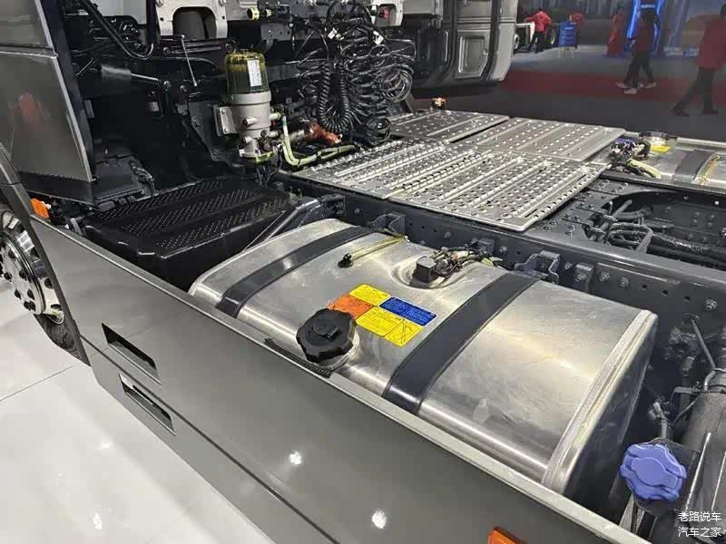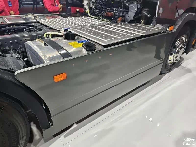 车架左侧布置了电瓶箱、油箱和尿素箱