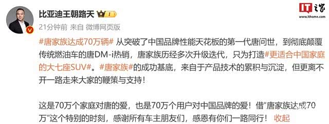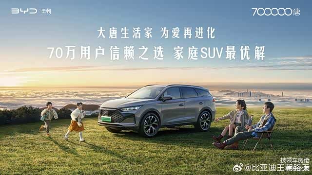 比亚迪王朝网销售事业部总经理路天宣布,唐家族达成 70 万辆。
