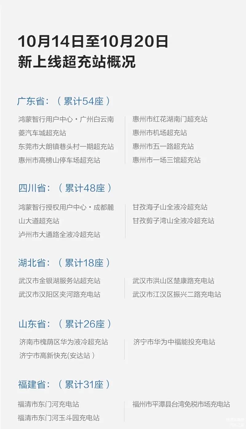 截至2024年10月20日,华为超充网络在全国已有413座华为超充站、7249个华为超充枪,覆盖30个省份的105个城市。除华为超充站外,鸿蒙智行还接入了14574座鸿蒙智行优选站(第三方运营),覆盖338个城市。