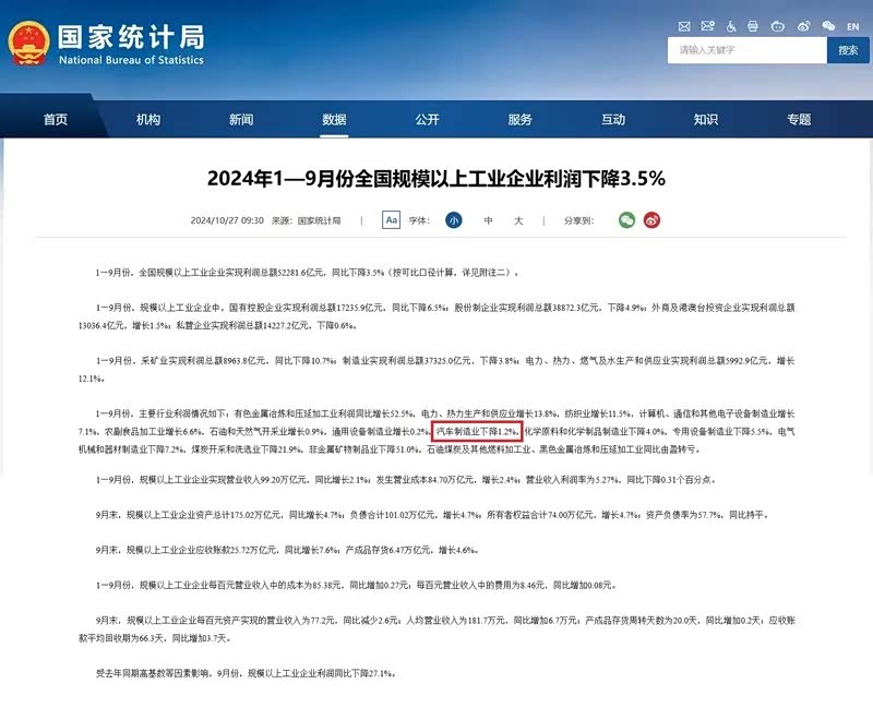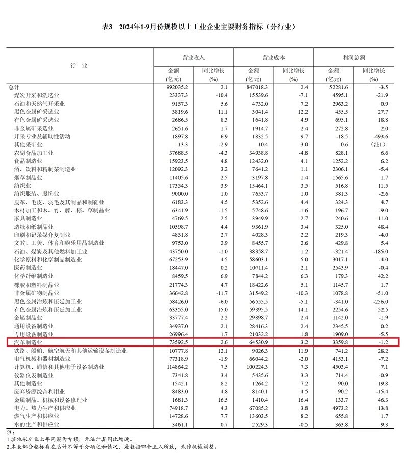 10月27日,国家统计局发布2024年1-9月份全国规模以上工业企业部分指标。1-9月份,全国规模以上工业企业实现利润总额52281.6亿元,同比下降3.5%,其中,汽车制造业利润总额3359.8亿元,同比下降1.2%,降幅低于全国规模以上工业企业平均水平。