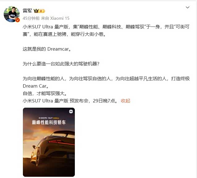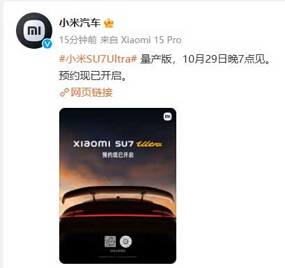 小米董事长兼CEO雷军在微博发文表示,10月29日晚将举办小米SU7 Ultra量产版的预发布会,暗示还将另选时间举行正式发布会。官方还放出了一张小米SU7 Ultra量产版的海报,展示了该车部分外观细节。