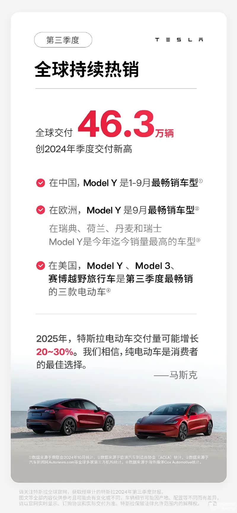 特斯拉官方宣布,2024年第三季度全球交付46.3万辆电动车,创季度交付新高。