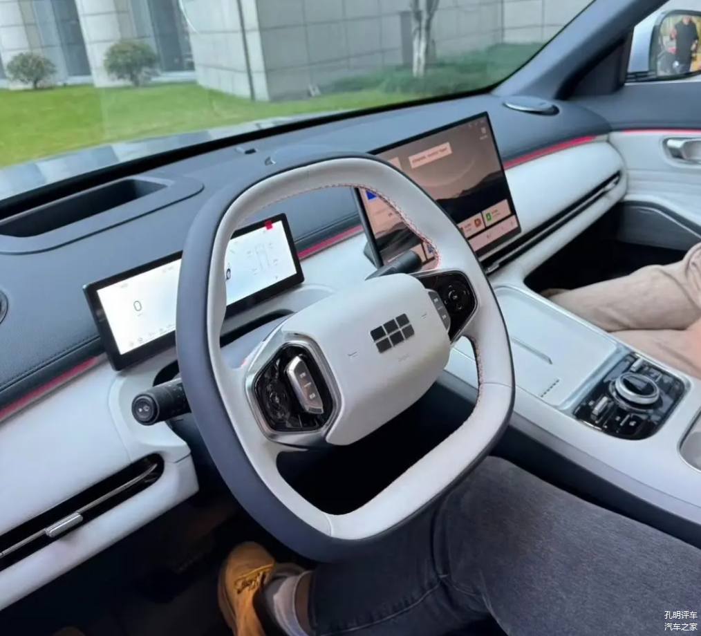 车内设计风格就是比较熟悉的新势力风格,主打中控悬浮车机屏幕,驾驶员前方则是较小尺寸的数字液晶仪表,当然匹配有抬头显示投影。细节用料比较考究,目前见到了实车采用了蓝白搭配的内饰软包材质用料,而且有环绕式的氛围灯。
