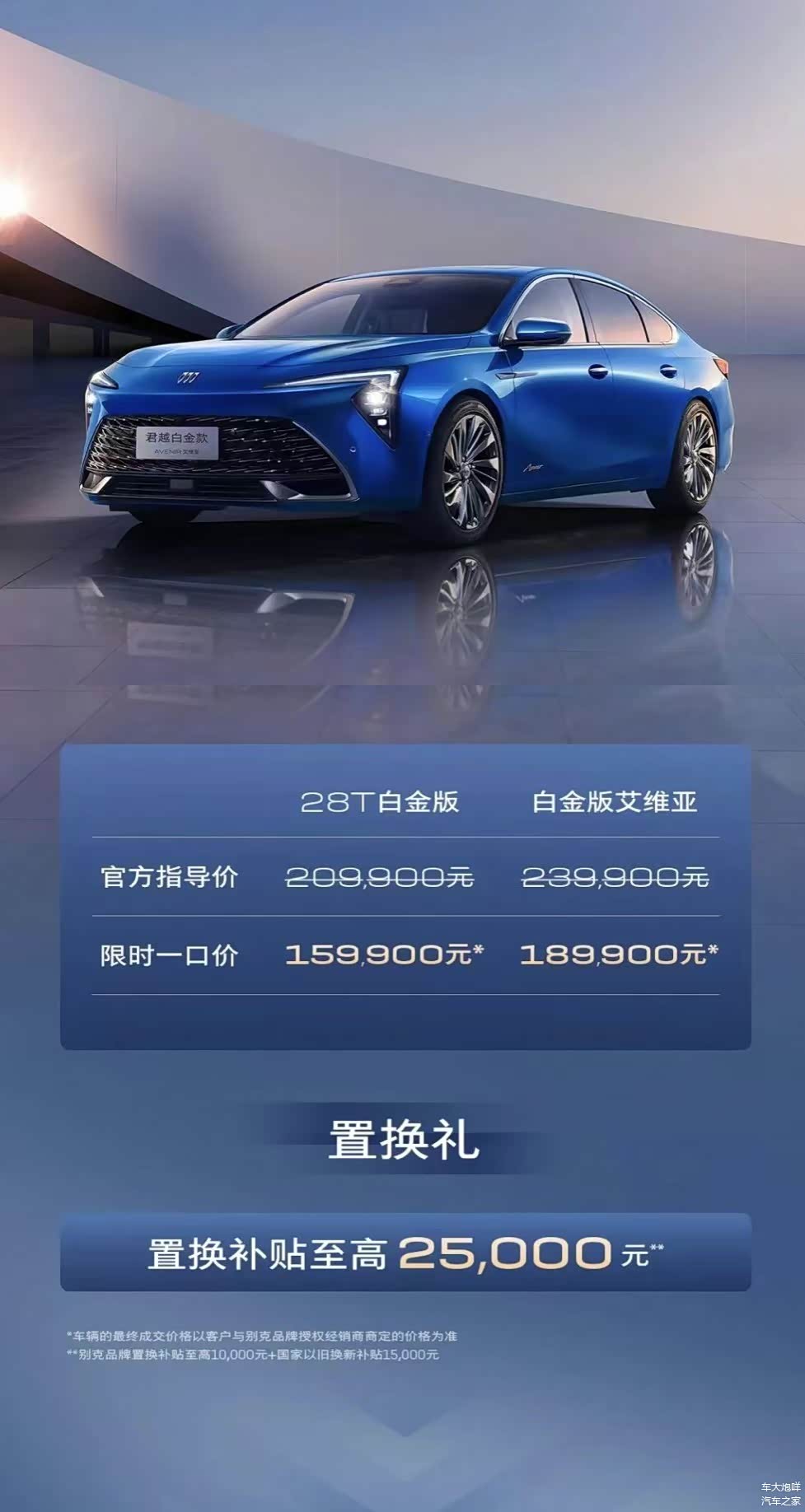 10月30日,上汽通用别克官方宣布,2025款别克君越白金款正式上市,提供2款车型给消费者选择,其中28T白金版的官方指导价为20.99万元,限时一口价15.99万元;白金版艾维亚的官方指导价为23.99万元,限时一口价18.99万元。此外,消费者购买2025款别克君越白金款可享至高2.5万元的置换补贴(含别克品牌置换补贴至高1万元+国家以旧换新补贴1.5万元)。