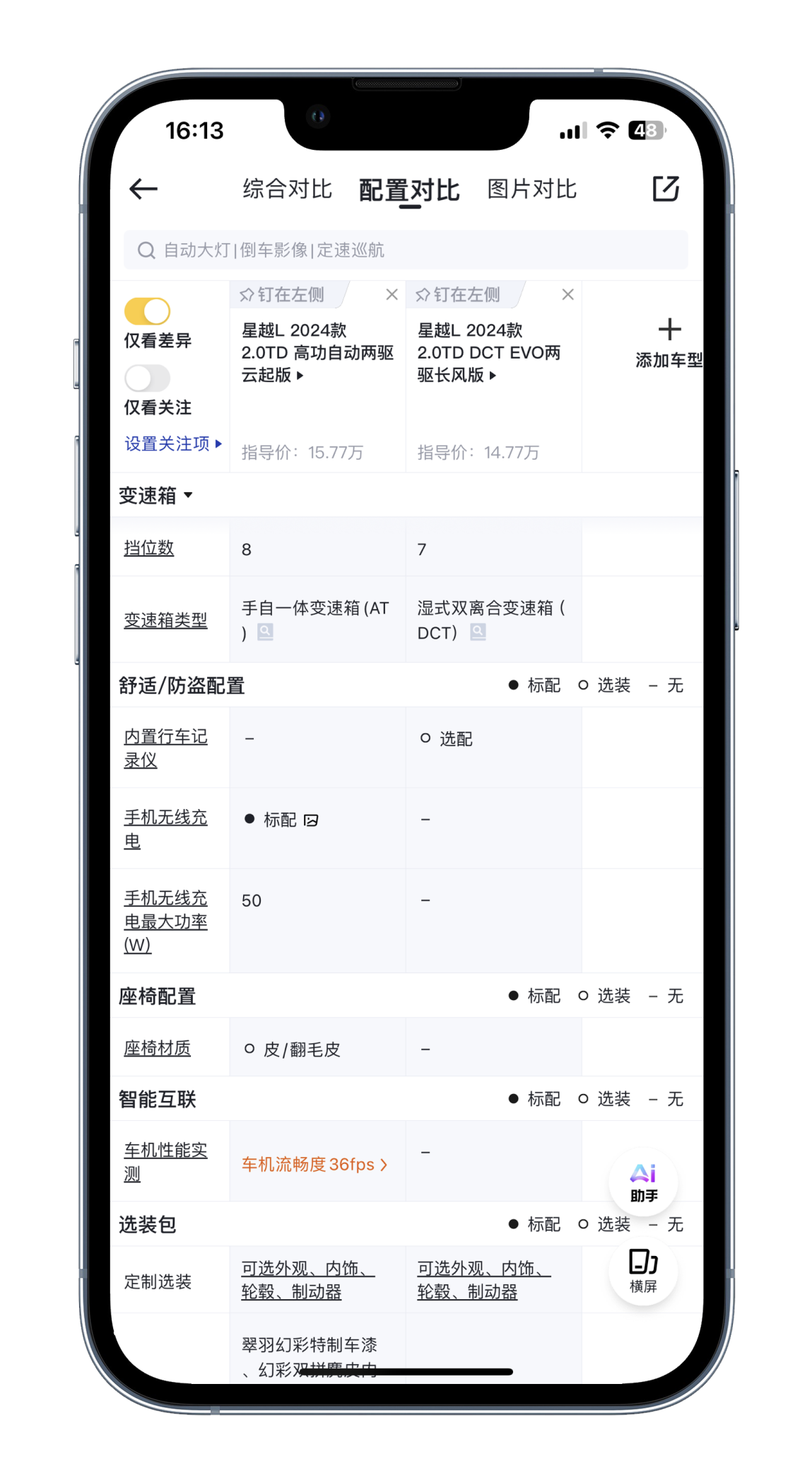 但实际吉利星越L目前却是双离合版更畅销,对比双离合的两驱长风版和2.0T高功率两驱云起版,一个售价14.77万,一个售价15.77万,两者价格只差了1万块钱,除了动力上的配置外,云起版只比长风版多了个50瓦的手机无线充电功能,可以说配置几乎持平。明明变速箱更稳定,动力上也更出色,那为啥8AT的版本还卖不过双离合版呢?